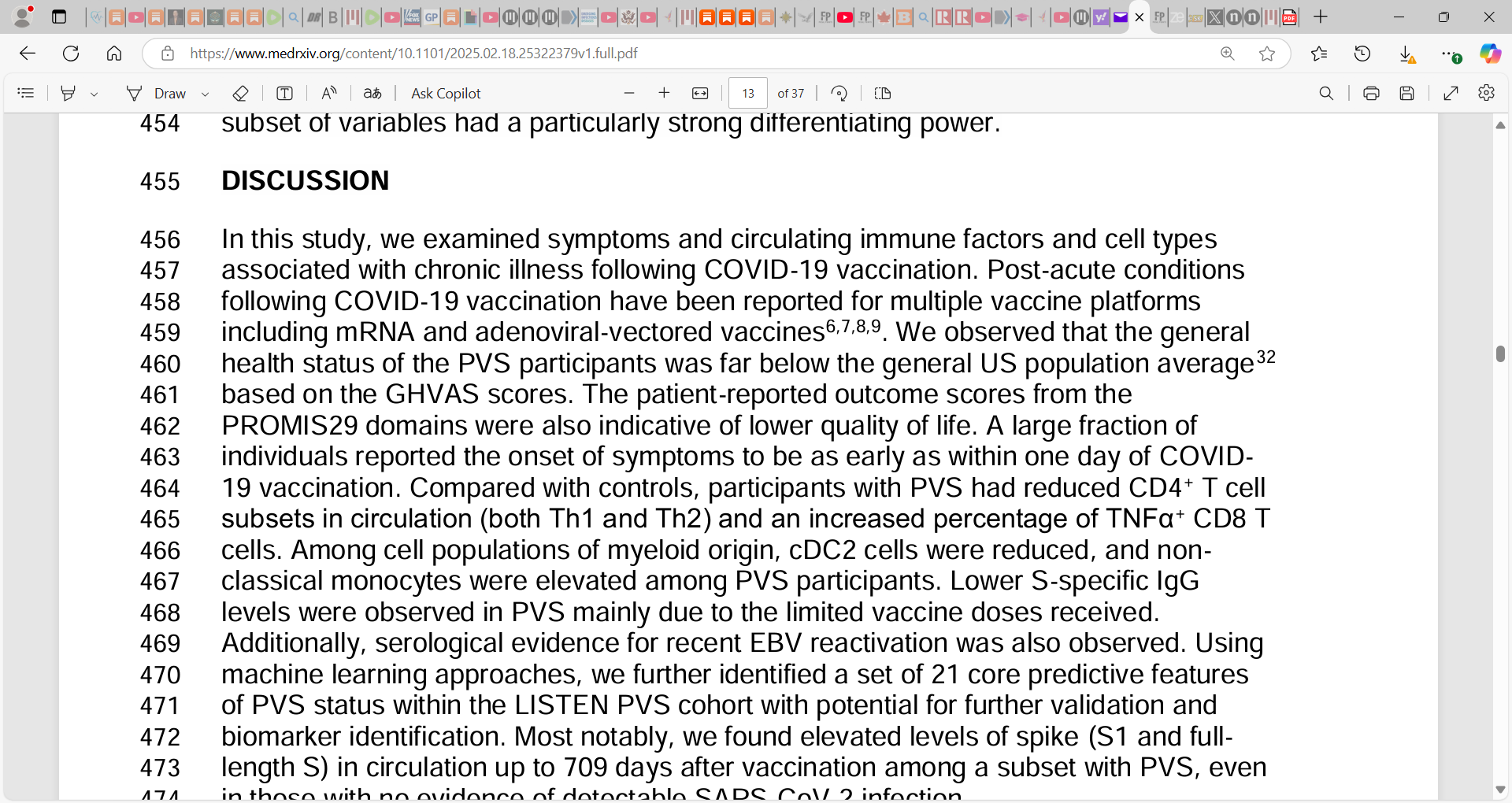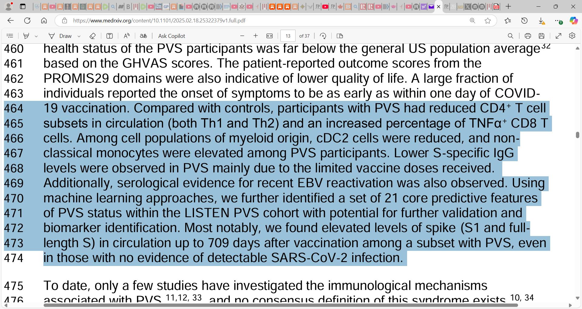 ‘Compared with controls, participants with PVS had reduced CD4+ T cell 464 subsets in circulation (both Th1 and Th2) and an increased percentage of TNFα+ CD8 T 465 cells. Among cell populations of myeloid origin, cDC2 cells were reduced, and non-466 classical monocytes were elevated among PVS participants. Lower S-specific IgG 467 levels were observed in PVS mainly due to the limited vaccine doses received. 468 Additionally, serological evidence for recent EBV reactivation was also observed. Using 469 machine learning approaches, we further identified a set of 21 core predictive features 470 of PVS status within the LISTEN PVS cohort with potential for further validation and 471 biomarker identification. Most notably, we found elevated levels of spike (S1 and full-472 length S) in circulation up to 709 days after vaccination among a subset with PVS, even 473 in those with no evidence of detectable SARS-CoV-2 infection.’