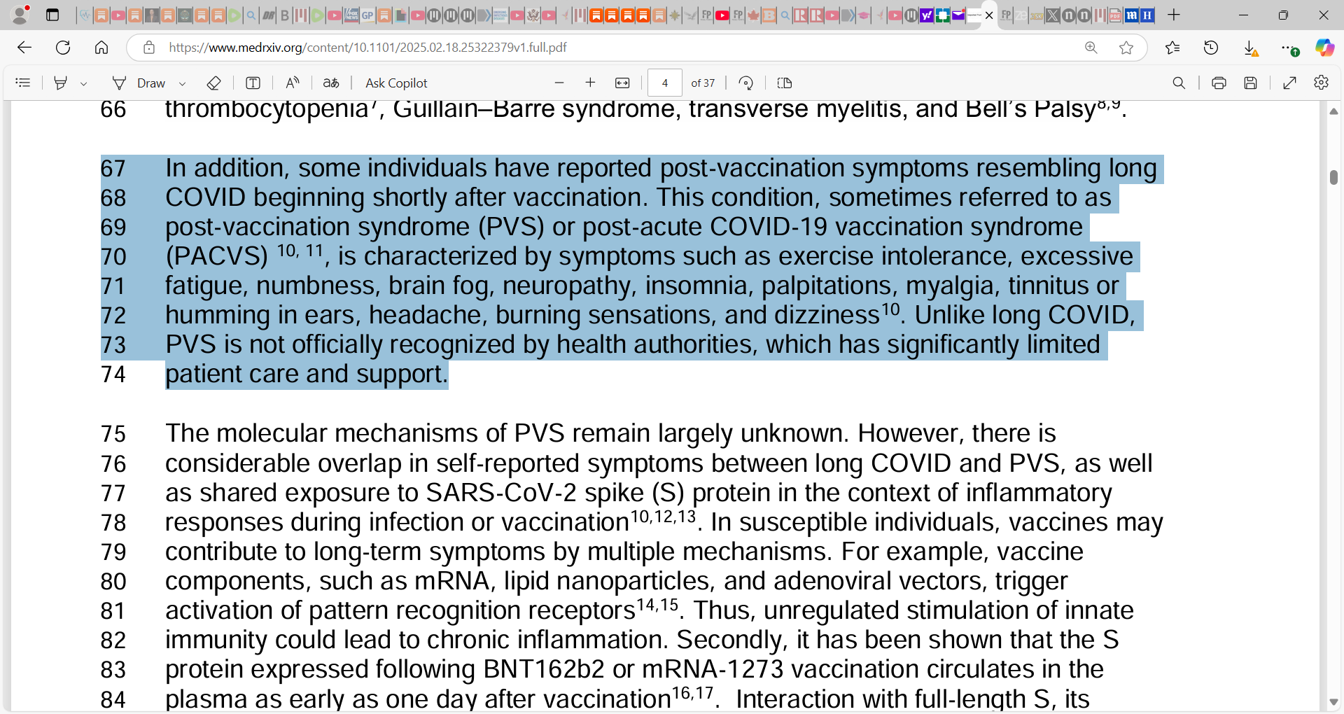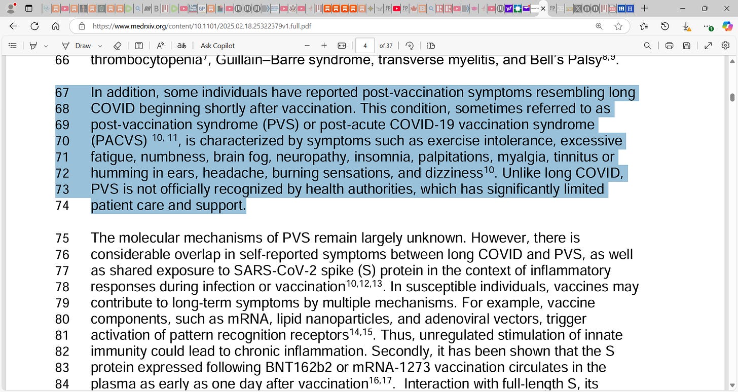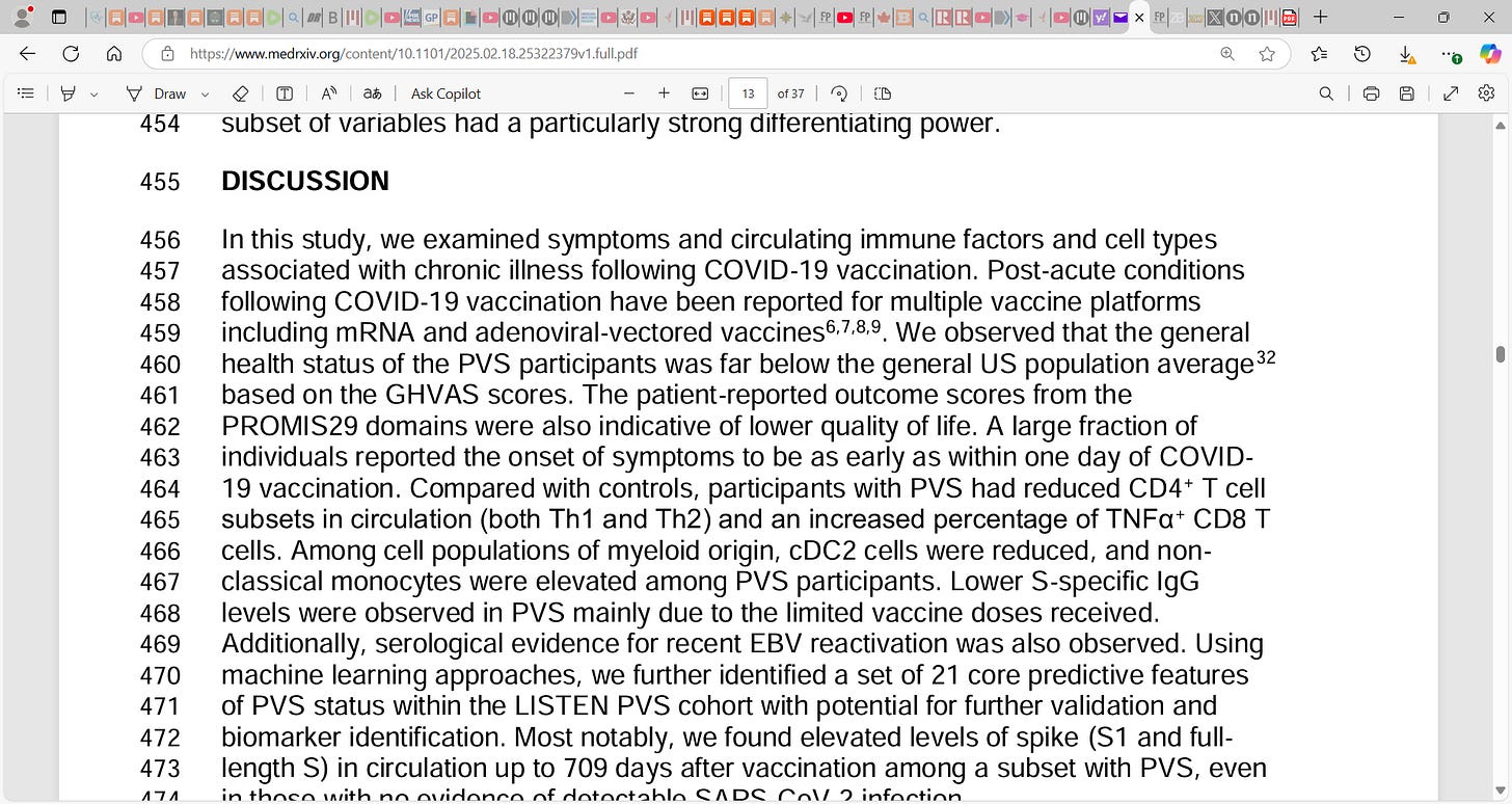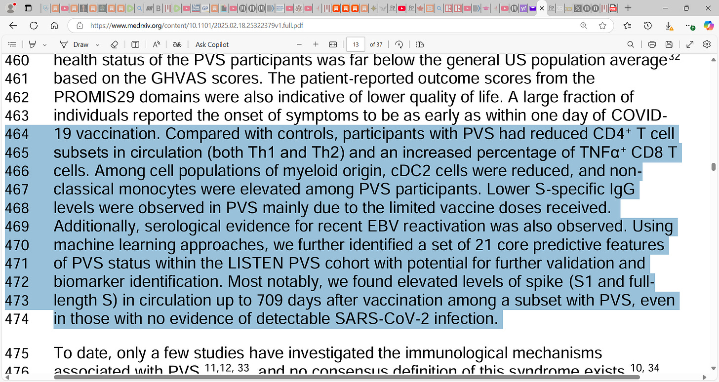 CD4+ helper T cells and impacts on CD8+ cytotoxic T-cells (immune overload and exhaustion), leaving one at risk of infection, and ‘elevated levels of circulating spike protein compared to healthy controls’. This means that the Bourla Bancel Malone et al. mRNA vaccine-induced spike protein persists for way longer than we were told (‘found elevated levels of spike (S1 and full-472 length S) in circulation up to 709 days after vaccination among a subset with PVS, even 473 in those with no evidence of detectable SARS-CoV-2 infection’) and thus can be present systemically across the body to do maximal damage to the healthy tissues causing acute and chronic inflammation, damage to the cardiovascular system e.g. the endothelial lining of the vasculature etc.