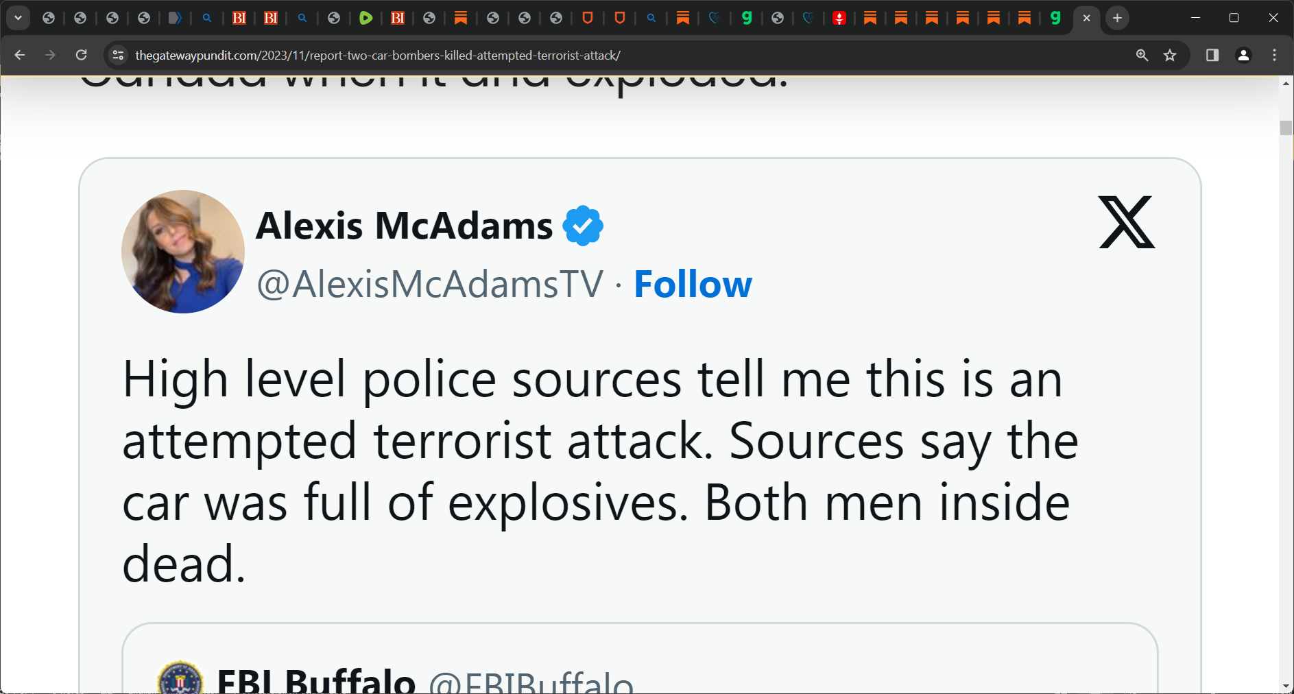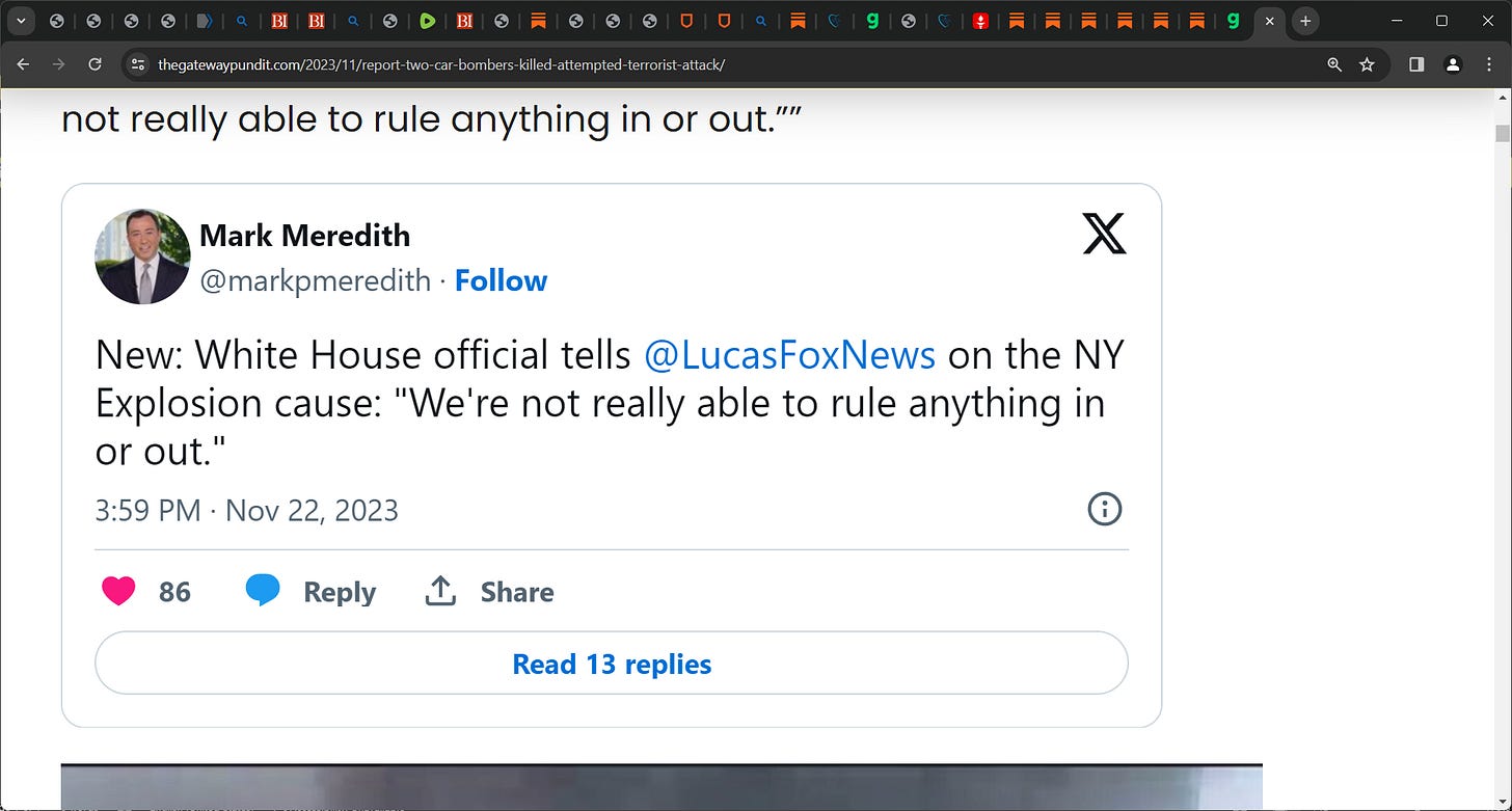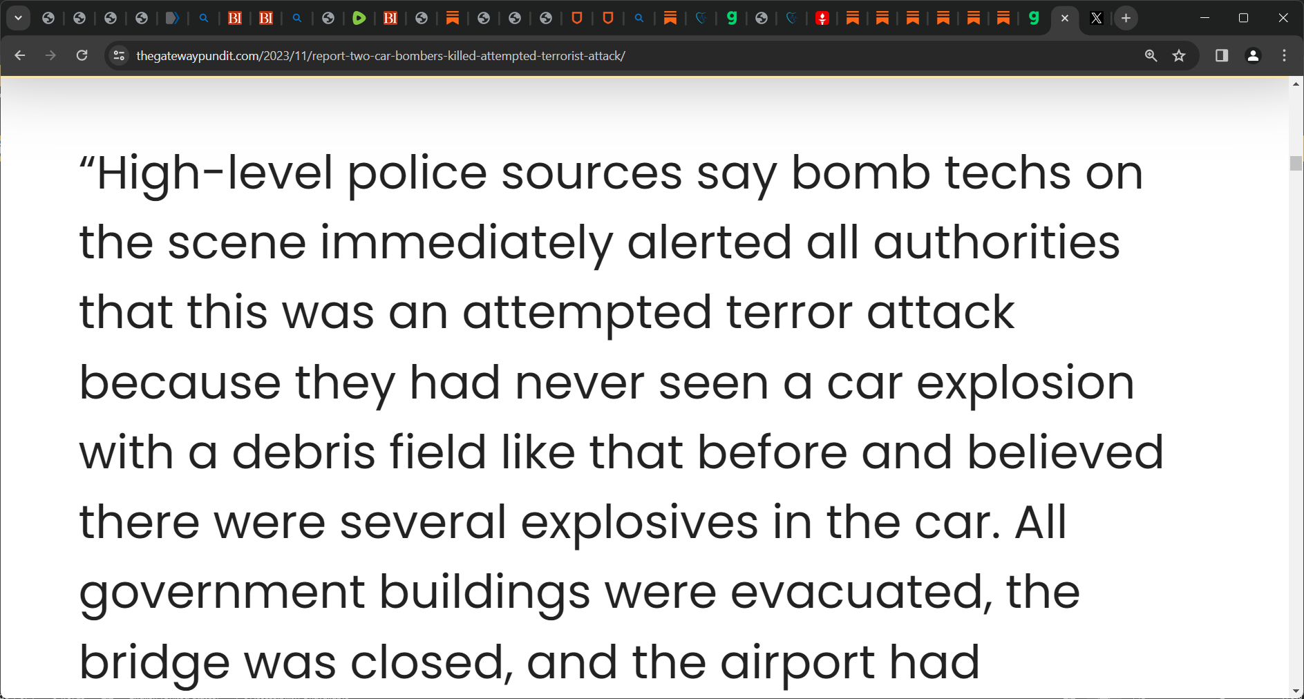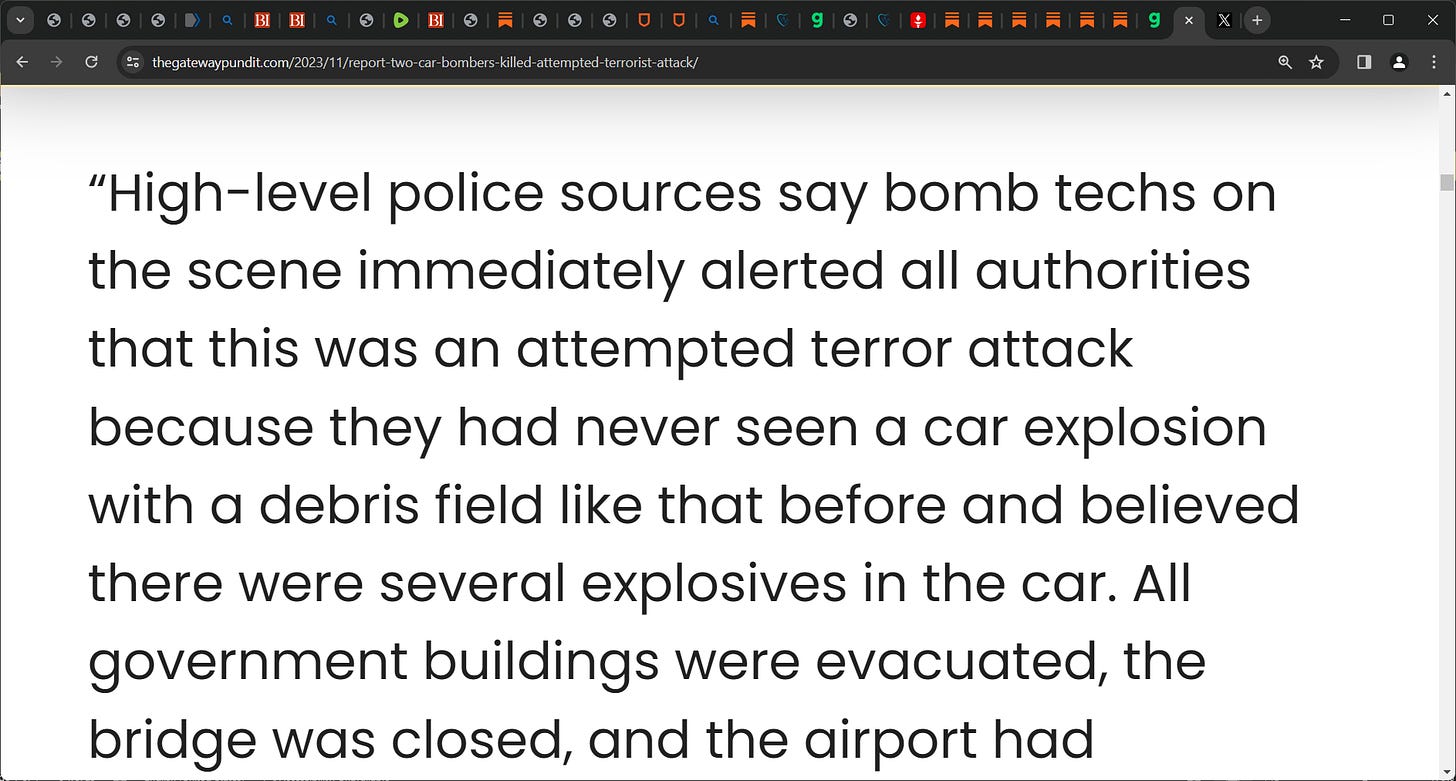 So many people, other than terrorists, have a tendency to drive around with explosives in their car. Sure that seems reasonable. 🤦♀️ I’m going with the first responders initial assessment. That always tends to lead to the truth if you can remember what the initial impressions were. It is usually an uncontrolled initial assessment that the government will redirect from to get the narrative they want the media to carry. The same thing happened with 9/11/2001, it also looks like what happened with the JFK assassination by recent statements from doctors that worked on him that day. The government doesn’t want a terror attack the day before a national holiday. They don’t want more problems at home now that they have allowed two wars to start in just a few years. They don’t want to acknowledge just how many terrorists they invited in under the guise of asylum. They have many many reasons to lie, to redirect attention, to change the story to nothing. It’s not nothing, it wasn’t a car with a stuck accelerator, it wasn’t just an accident... with all the verifiable lies the government has told in just the last 3.5 years I don’t understand those that still try to give them or MSM (their partner in crime) the benefit of the doubt. They are lying, the question is why, what are they trying to cover up?