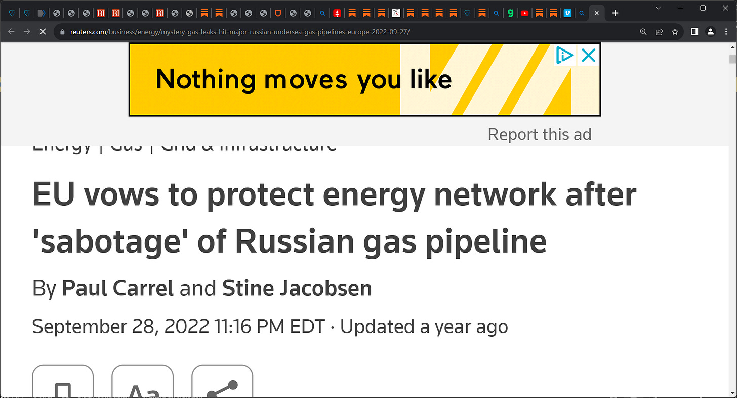 ‘As Winter approaches, and a little over a year after the Nord Stream pipeline was sabotaged (by the US, according to Pulitzer-winner Seymour Hersh), a new disruption in European energy pipelines is reaching the headlines.