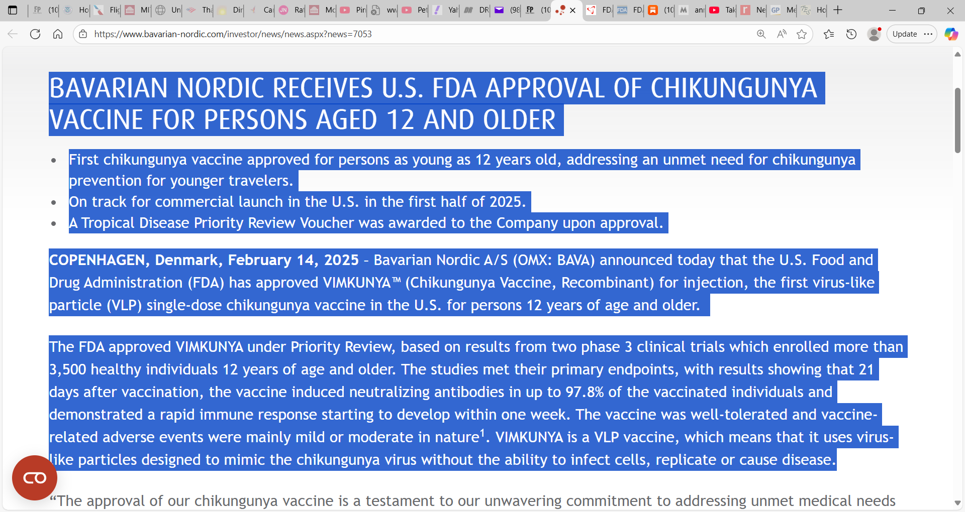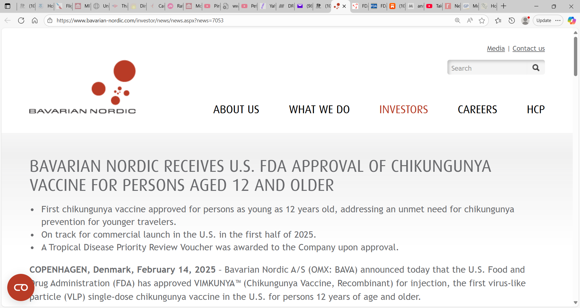 ‘COPENHAGEN, Denmark, February 14, 2025 – Bavarian Nordic A/S (OMX: BAVA) announced today that the U.S. Food and Drug Administration (FDA) has approved VIMKUNYA™ (Chikungunya Vaccine, Recombinant) for injection, the first virus-like particle (VLP) single-dose chikungunya vaccine in the U.S. for persons 12 years of age and older.
