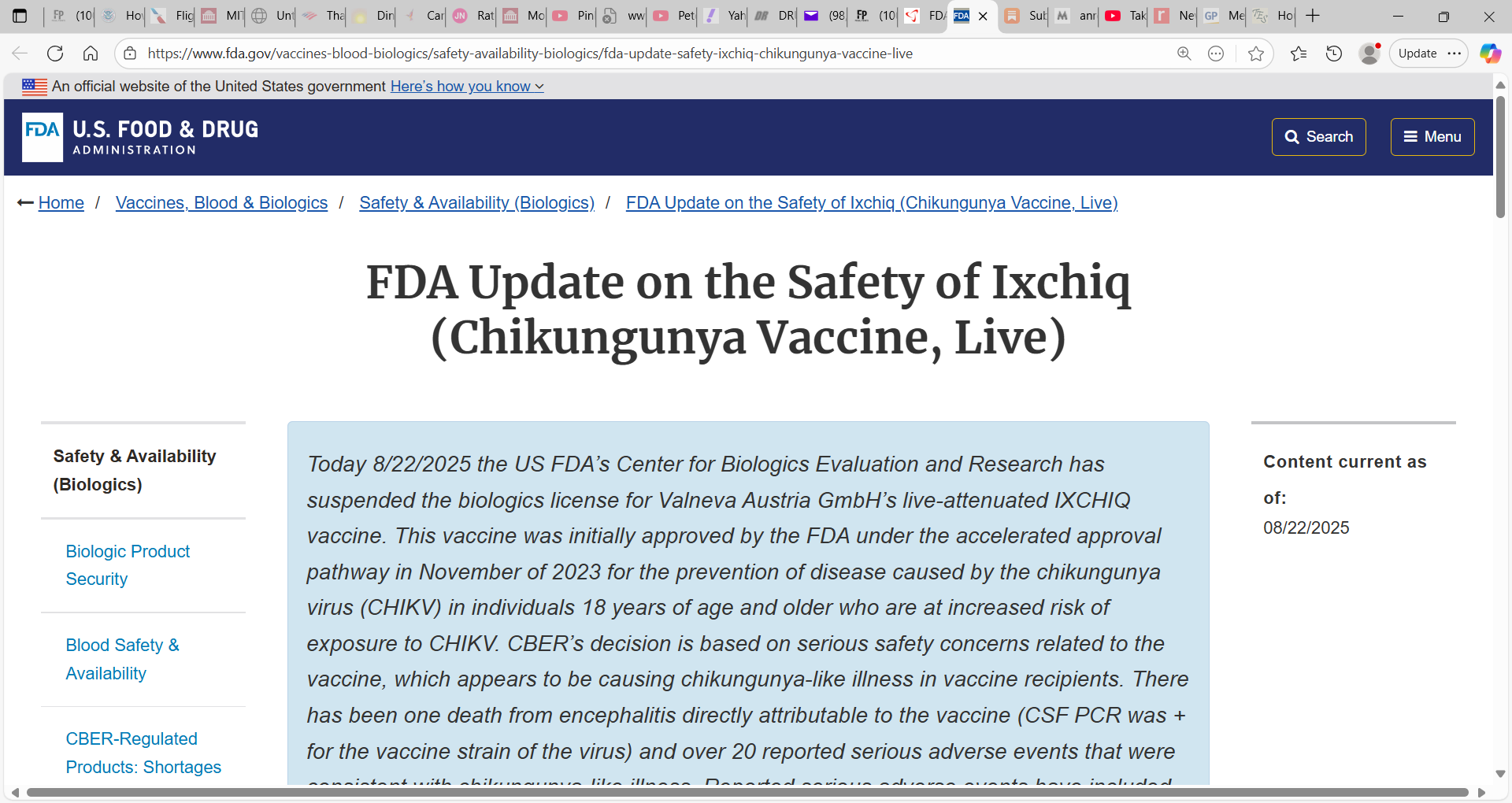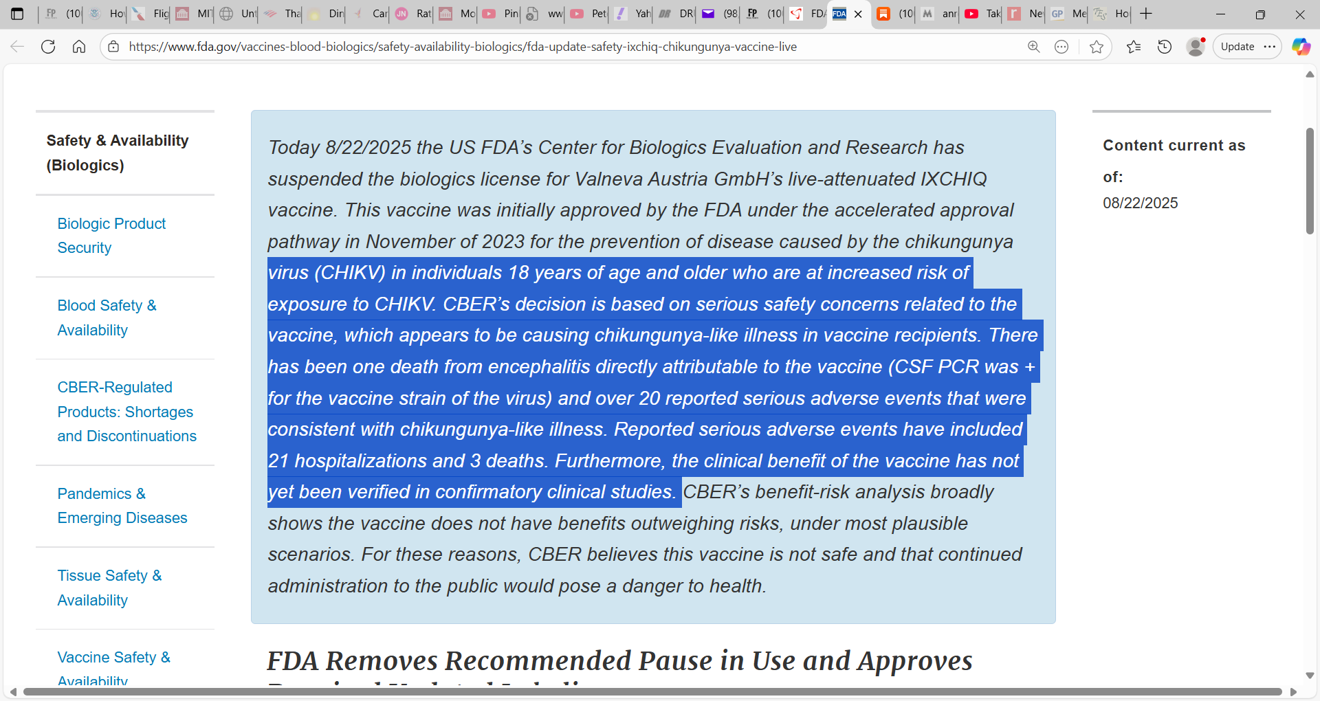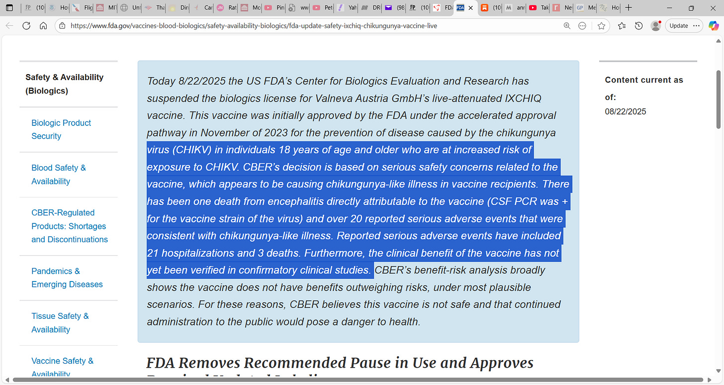 ‘Today 8/22/2025 the US FDA’s Center for Biologics Evaluation and Research has suspended the biologics license for Valneva Austria GmbH’s live-attenuated IXCHIQ vaccine. This vaccine was initially approved by the FDA under the accelerated approval pathway in November of 2023 for the prevention of disease caused by the chikungunya virus (CHIKV) in individuals 18 years of age and older who are at increased risk of exposure to CHIKV. CBER’s decision is based on serious safety concerns related to the vaccine, which appears to be causing chikungunya-like illness in vaccine recipients. There has been one death from encephalitis directly attributable to the vaccine (CSF PCR was + for the vaccine strain of the virus) and over 20 reported serious adverse events that were consistent with chikungunya-like illness. Reported serious adverse events have included 21 hospitalizations and 3 deaths. Furthermore, the clinical benefit of the vaccine has not yet been verified in confirmatory clinical studies. CBER’s benefit-risk analysis broadly shows the vaccine does not have benefits outweighing risks, under most plausible scenarios. For these reasons, CBER believes this vaccine is not safe and that continued administration to the public would pose a danger to health.’