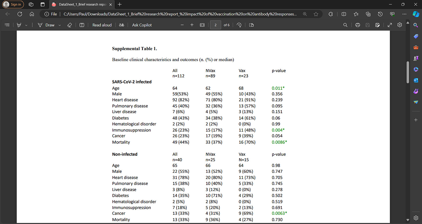 Now if we look further at the Table 1 supplemental, it tells us that the infected vaccinated were older, had greater immune suppression, cancer etc. and it could be that the vaccinated group were generally sicker. Disbalance is still seen even in non-infected.