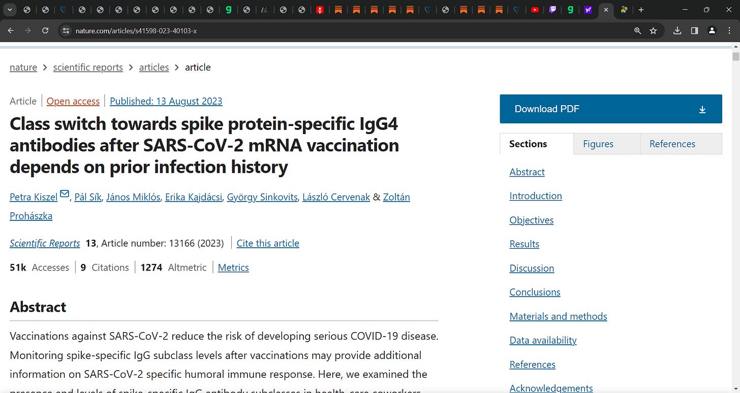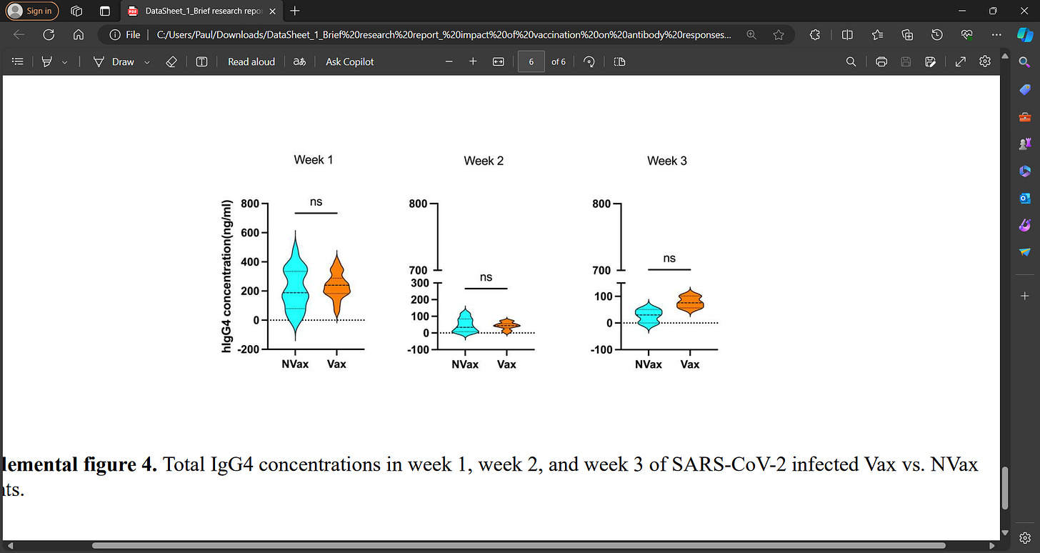 Researchers also found ‘a trend for increased total IgG4 Ab, which promotes immune tolerance, in the Vax vs. NVax patients in week 3.’ We see this class switch to IgG4 in other studies (and it is a dangerous development in the vaccinated) e.g. Pascal Irrgang et al.: