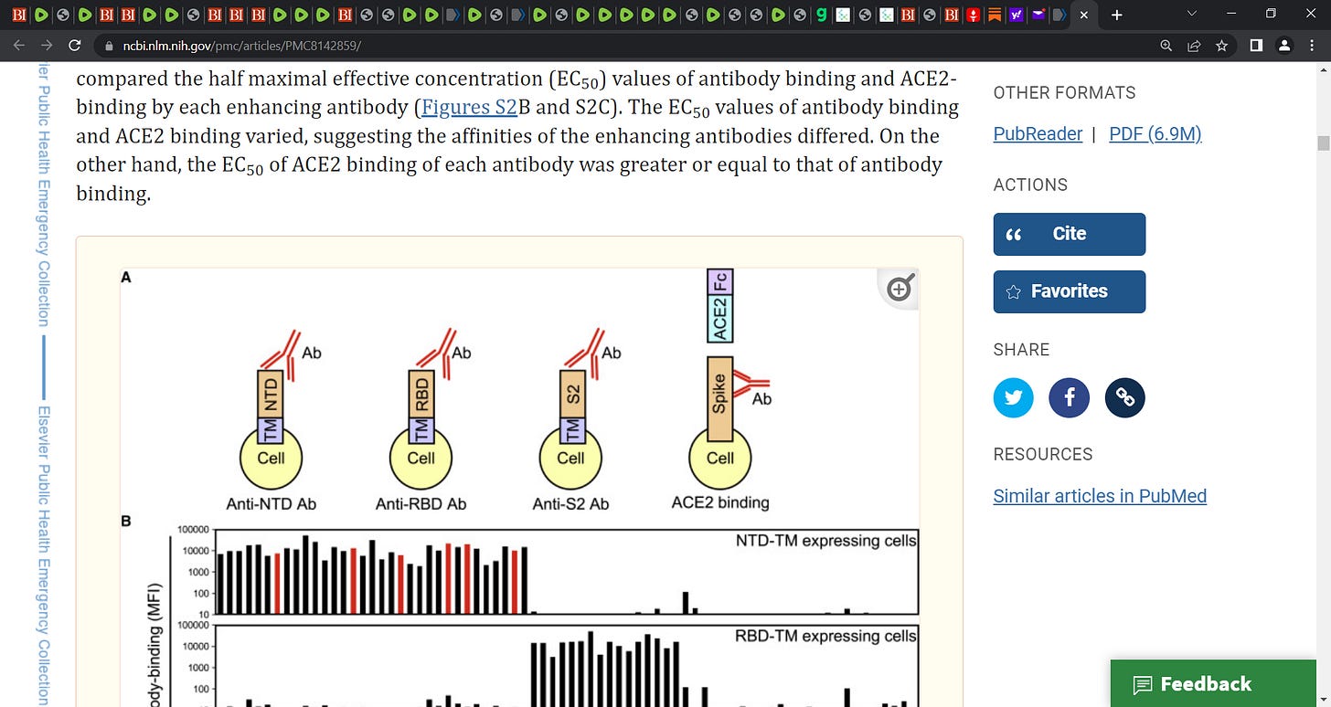 A reader pointed out a key question and I have edited the title for we are strongly inferring that the vaccinal antibodies operate similarly (the antigenic-specific non-neutralizing vaccinal antibodies)…see also Yahi et al. that helps with this picture: Infection-enhancing anti-SARS-CoV-2 antibodies recognize both the original Wuhan/D614G strain and Delta variants. A potential risk for mass vaccination?