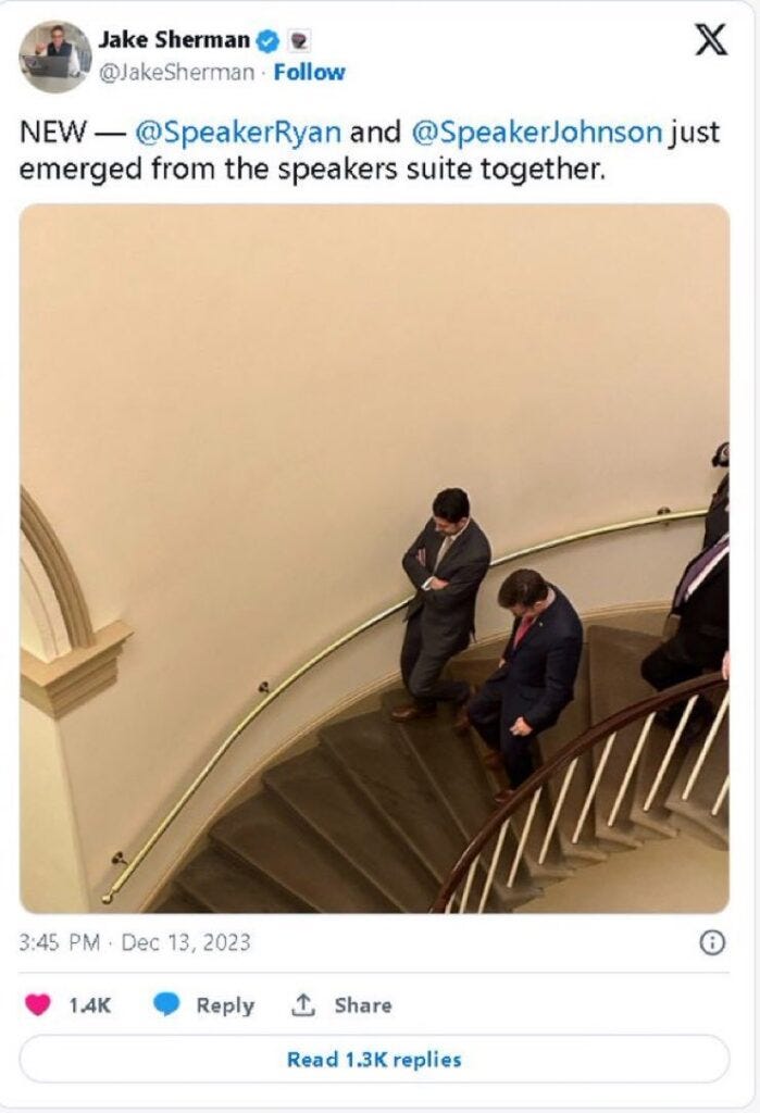 Why would Speaker Mike Johnson be seen here in this stairwell with past speaker Paul 'Benedict Arnold beelzebub' Ryan, arguably with Obama, to be 2 of the most dangerous men ever to hold high office;