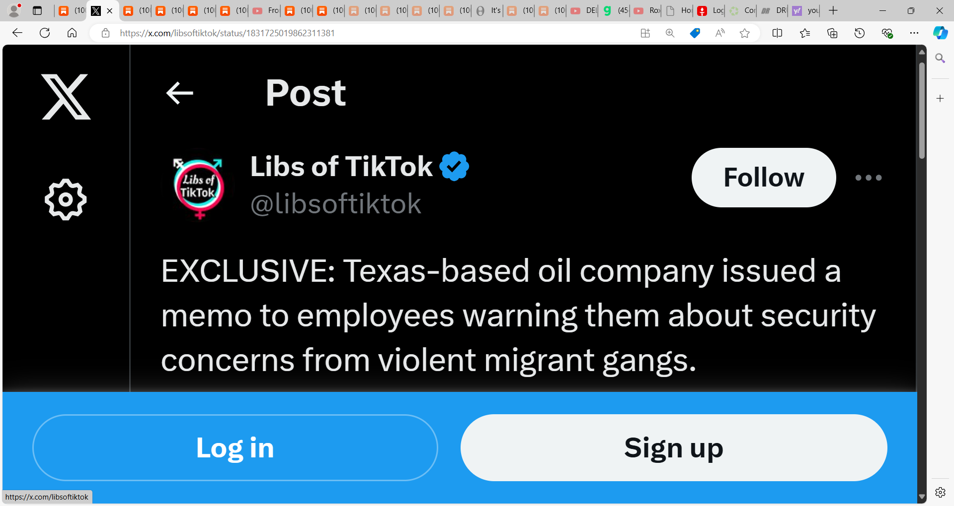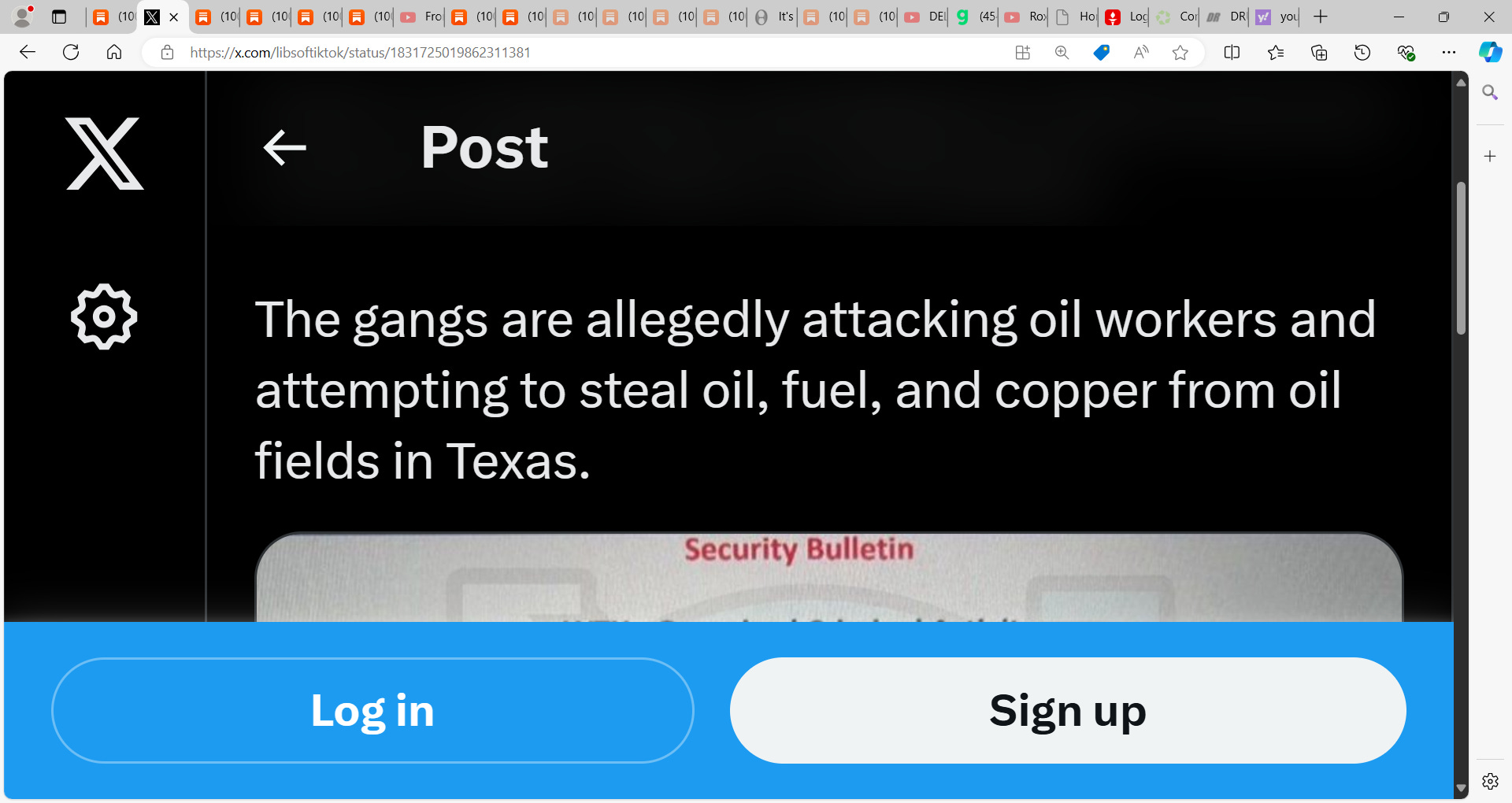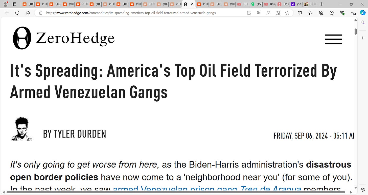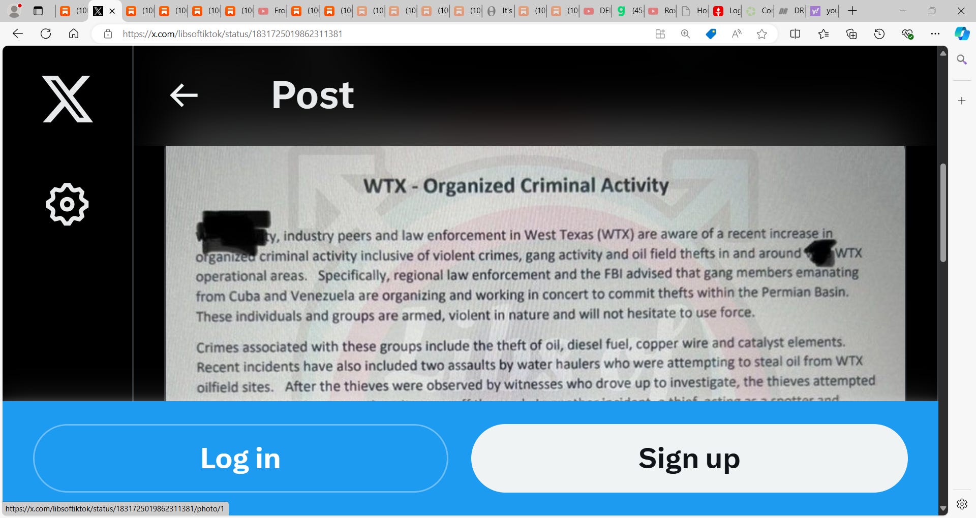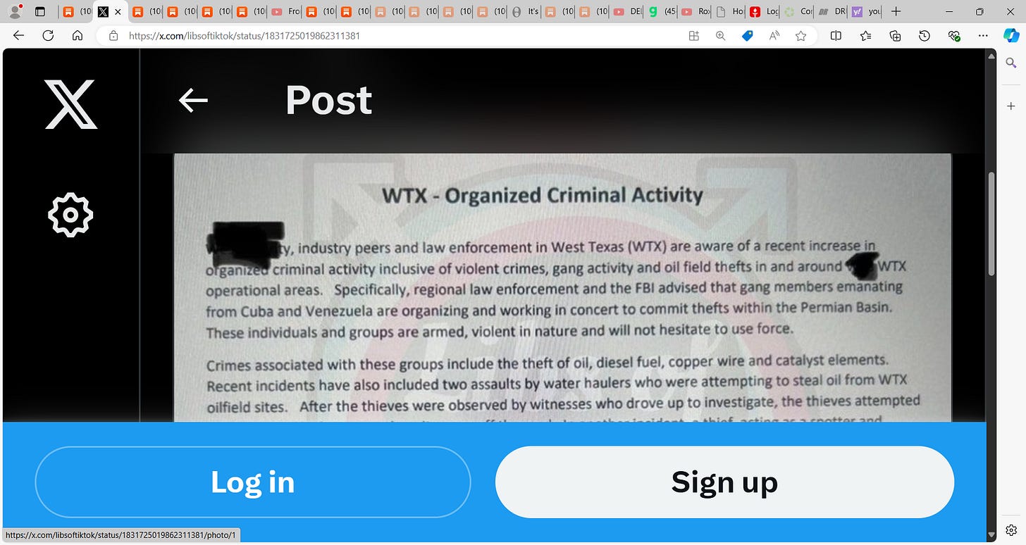 According to Libs of TikTok, a Texas-based oil/gas company issued a memo to employees informing them that police and the FBI have warned armed Cuba and Venezuela migrant gangs are committing thefts in the Permian Basin (America's highest producing oil field).