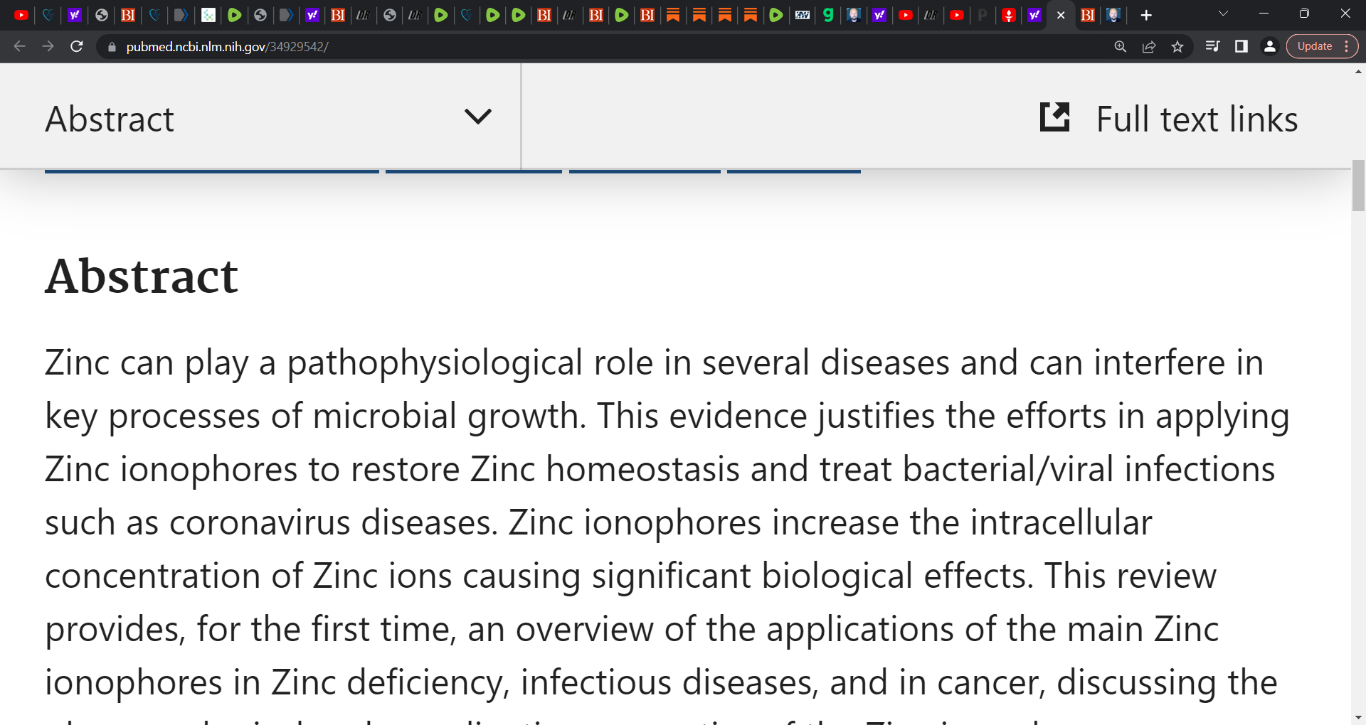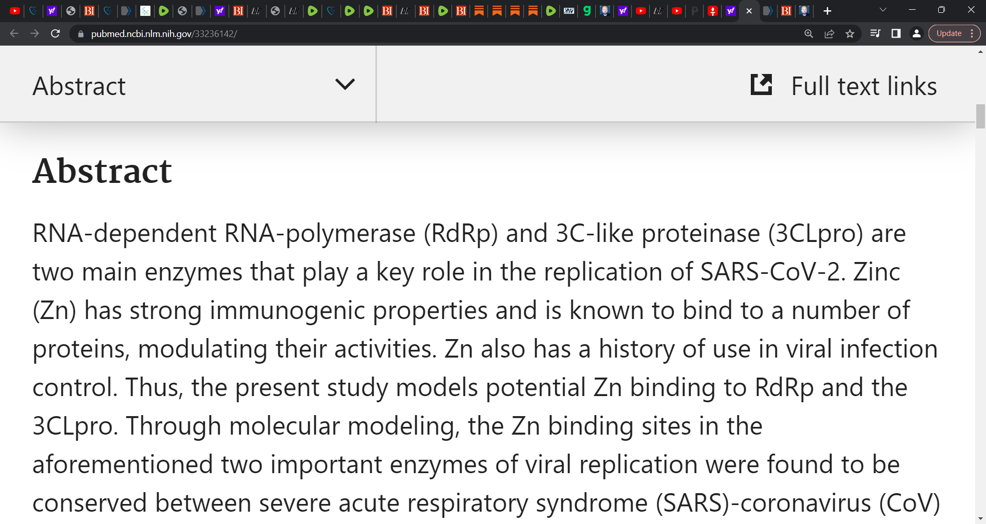 ‘RNA‑dependent RNA‑polymerase (RdRp) and 3C‑like proteinase (3CLpro) are two main enzymes that play a key role in the replication of SARS‑CoV‑2. Zinc (Zn) has strong immunogenic properties and is known to bind to a number of proteins, modulating their activities. Zn also has a history of use in viral infection control.’
